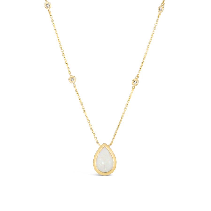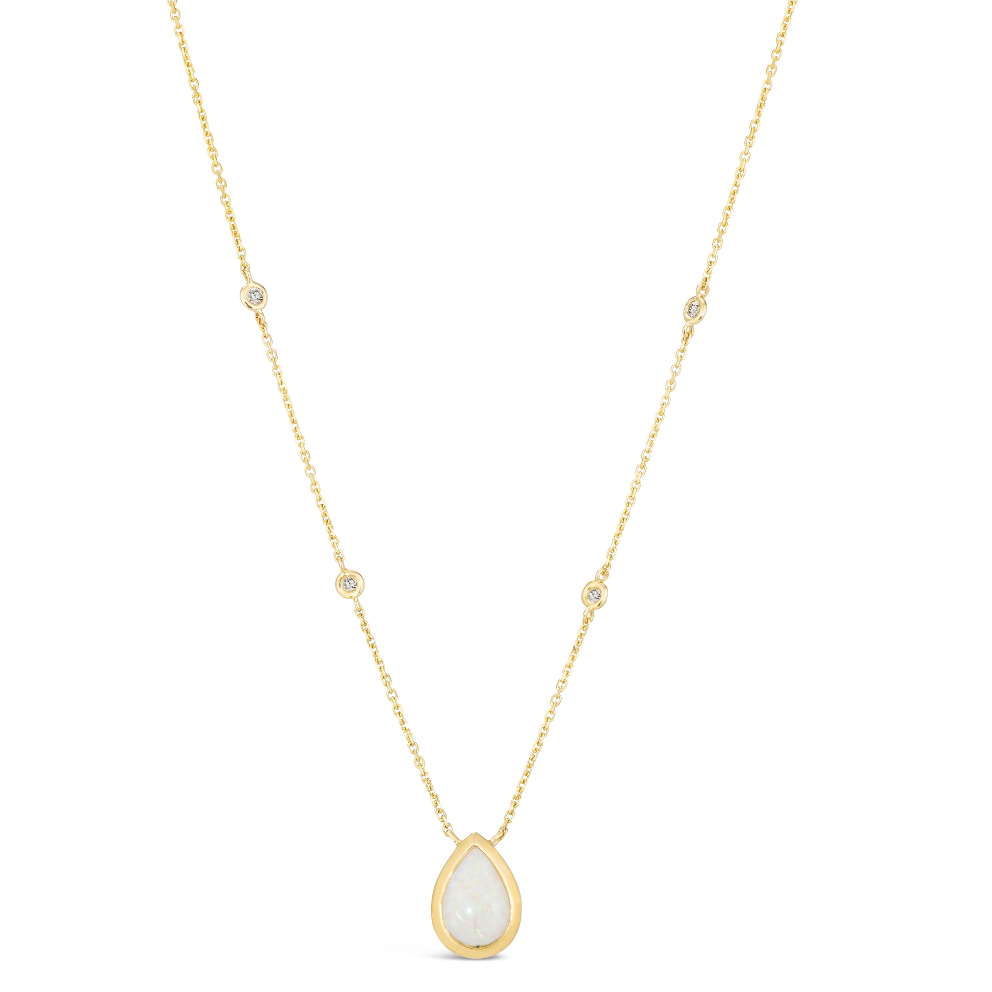 14K Yellow Gold 1.28 TCW Natural Pear Shape Opal and White Diamond Necklace