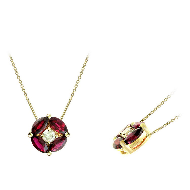 14K Yellow Gold .90 TCW Natural White Diamond Marquise Cut Red Ruby Pendant