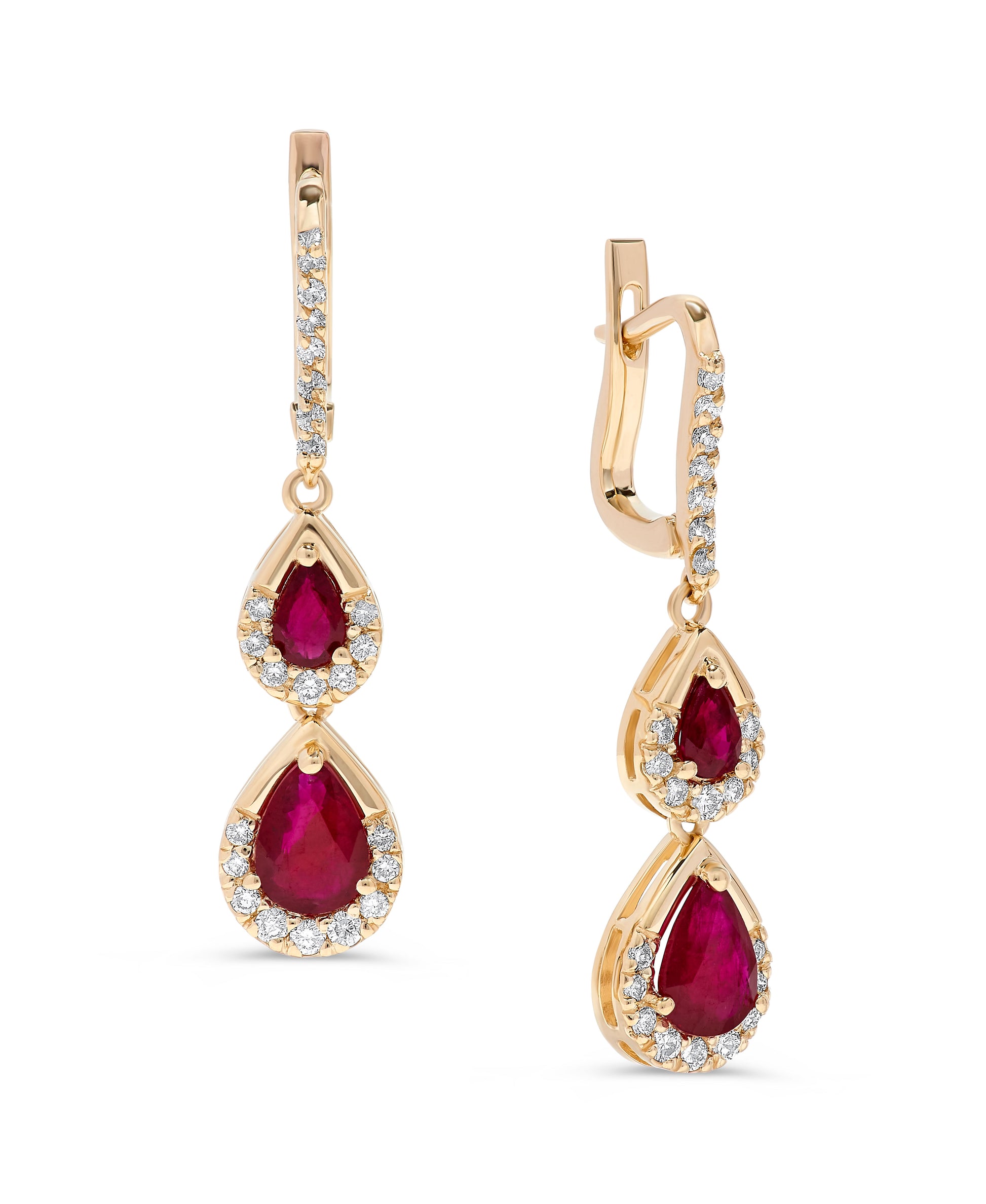 14K Yellow Gold 2.50 TCW Natural Pear-Shaped Red Ruby Earrings with Diamonds