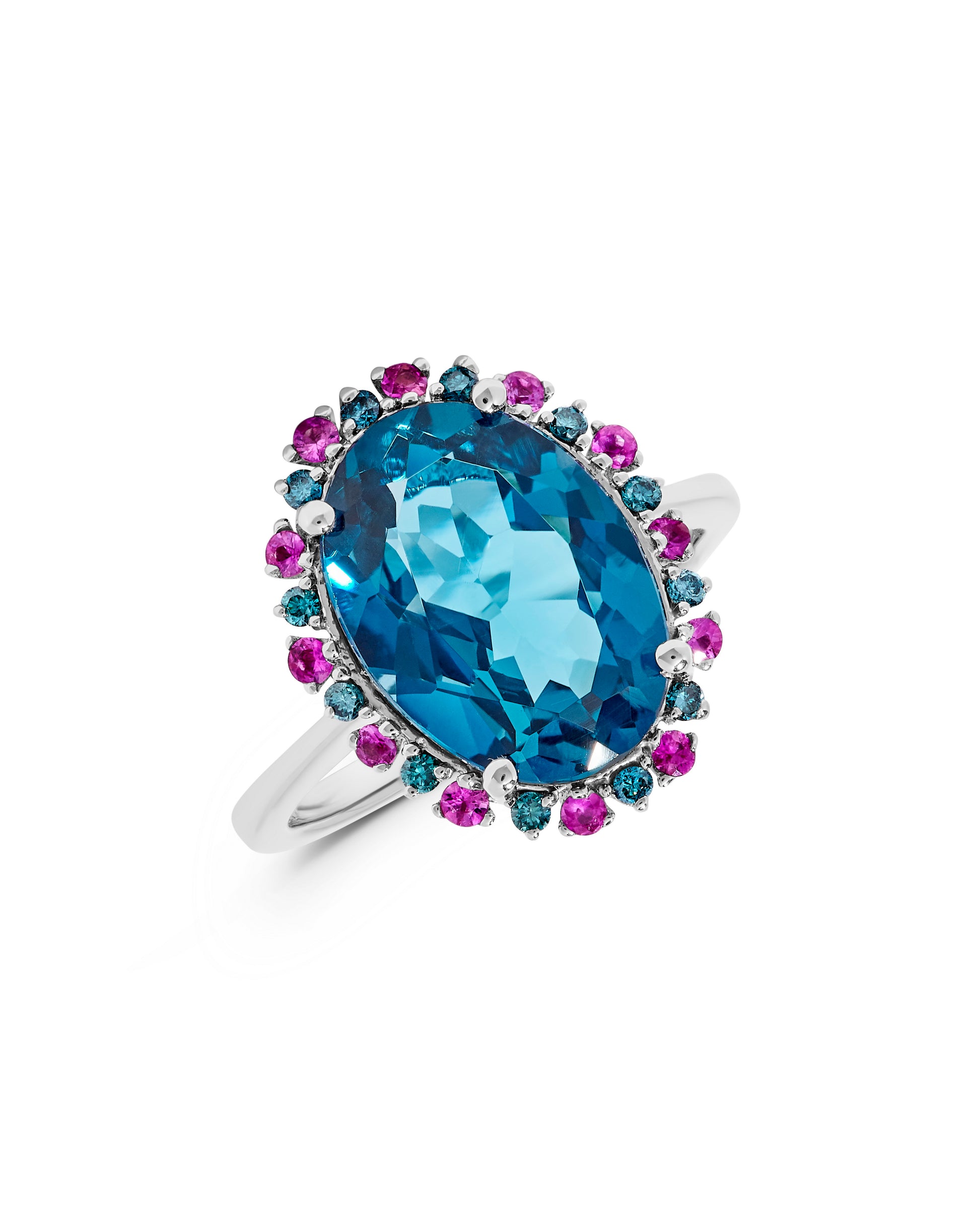 8.78 TCW Natural Oval Cut Blue Topaz with Diamonds 14K White Gold Ring